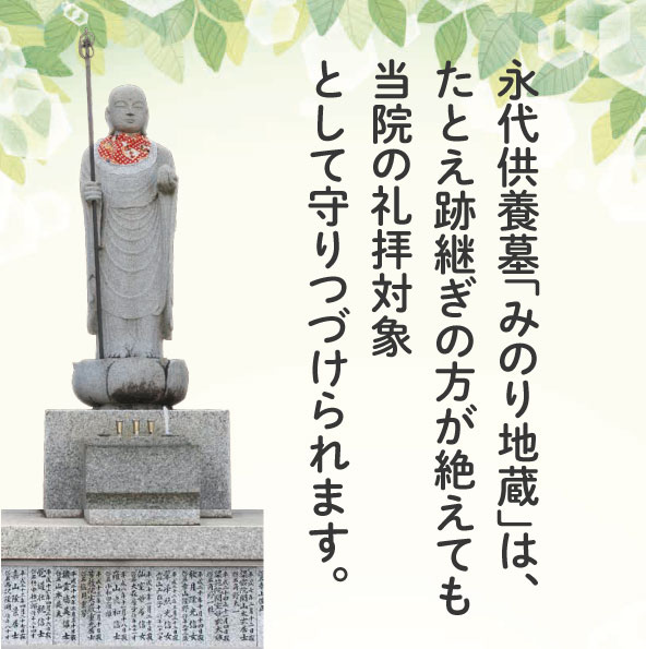 永代供養墓「みのり地蔵」は、たとえ跡継ぎの方が絶えても当院の礼拝対象として守りつづけられます。